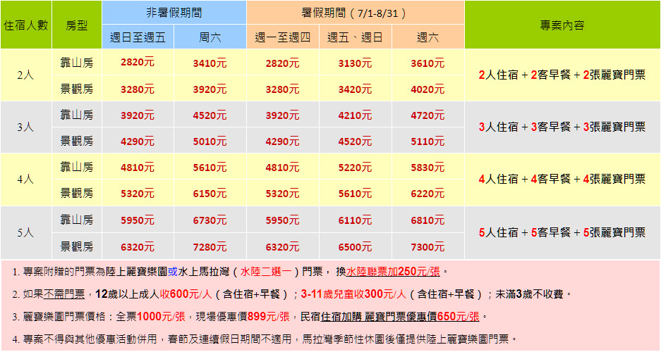A:12歲以上成人收600元/人(含住宿+早餐);3-11歲兒童收300元/人(含住宿+早餐);不含麗寶樂園門票;至於未滿3歲的幼兒,則不收費。